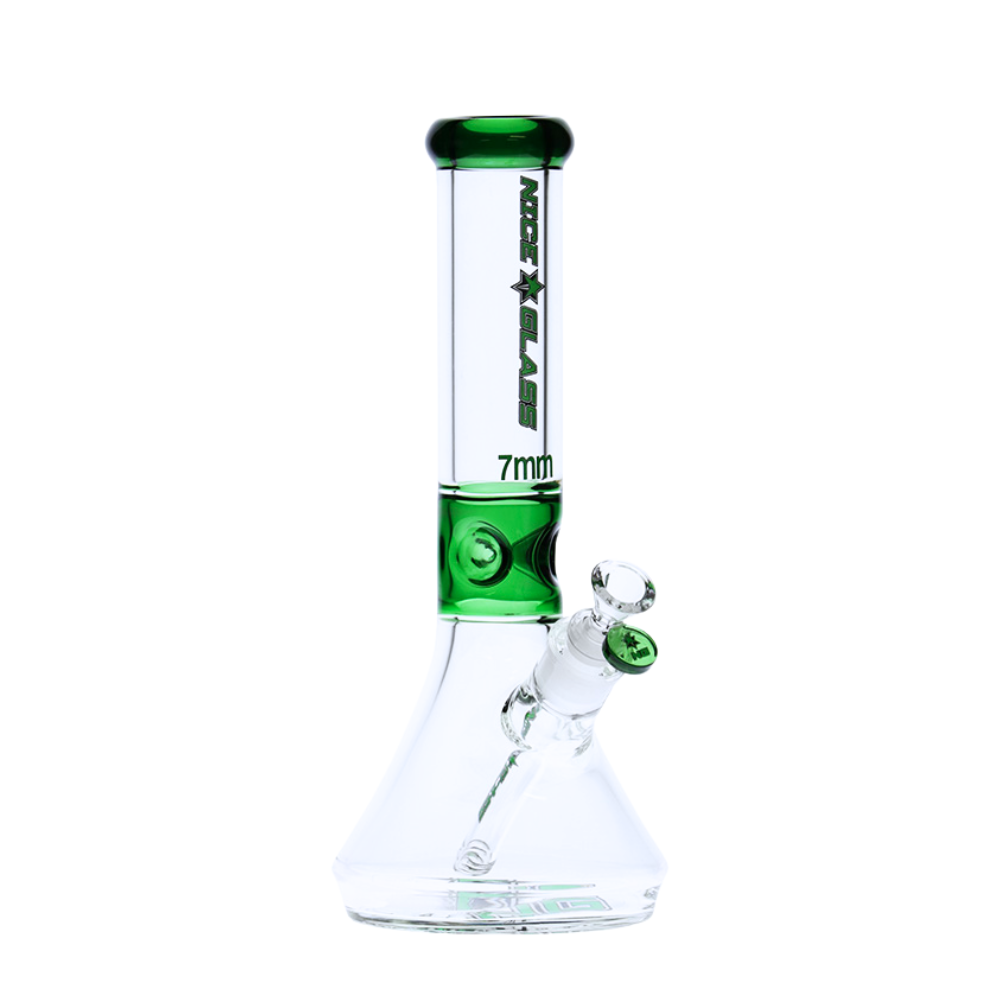 The Nice Glass Flat Base 7mm Beaker Bong offers both durability and style with its sleek design and premium features. Made from high-quality borosilicate glass, this bong features a flat base that tapers slightly toward the tube for added stability. It also includes ice notches made of coloured borosilicate glass, allowing you to add ice for a cooler, smoother smoke. The thick mouthpiece and herb bowl roll stopper further enhance the bong’s functionality and aesthetic. The NG logo is elegantly displayed on the base in a matching colour, making it a standout piece for any collection. Available in a variety of colours, this long-lasting glass piece is a must-have for those who value both performance and style. Key Features: Material: Borosilicate glass for superior durability. Flat base: Slightly tapered toward the tube for enhanced stability. Thickness: 7mm for added strength and longevity. Ice pinch: Coloured ice notches for a smoother, cooler smoke. Roll stopper: Thick mouthpiece and herb bowl with roll stopper for secure use. Base diameter: 120mm for optimal balance. Colour options: Available in a range of stylish colours. The Nice Glass 7mm Flat Base Beaker Bong combines quality craftsmanship, durability, and design into one exceptional piece. Whether you’re a casual smoker or a collector, this bong is built to deliver a smooth smoking experience while adding a touch of elegance to your setup.